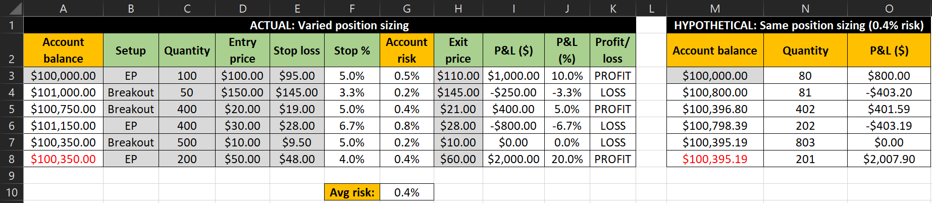 Finally, compare your closing account balances of your actual and hypothetical trades (A8 and M8, in red, in the screenshot above).