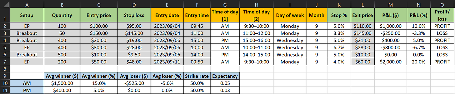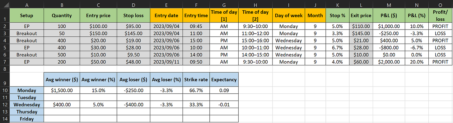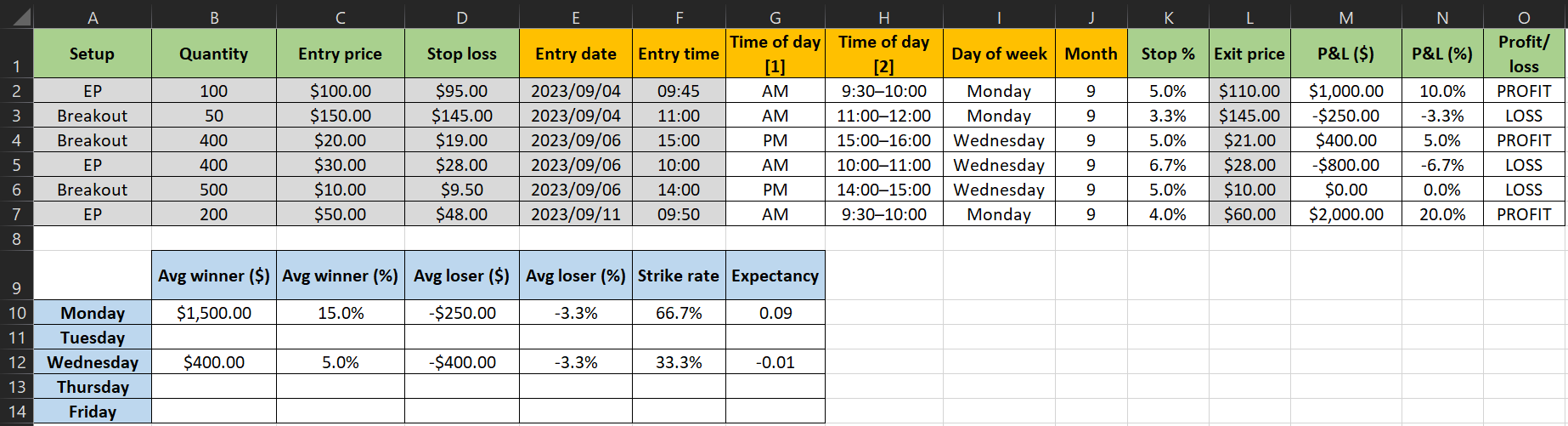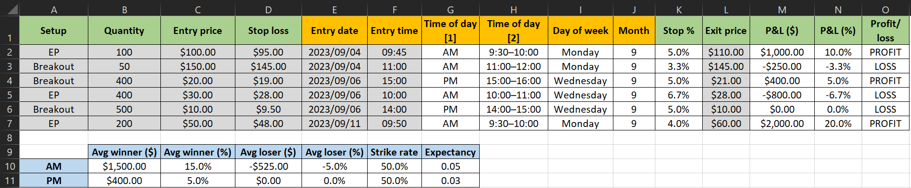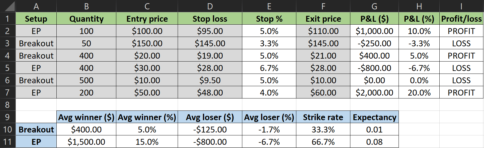 Taking table A9:G11 at face value, it’s pretty obvious that although this person has an edge (positive expectancy) in both their setups, they are far more profitable in EPs than in breakouts — an 8x higher expectancy, to be exact. That’s a pretty strong signal.
