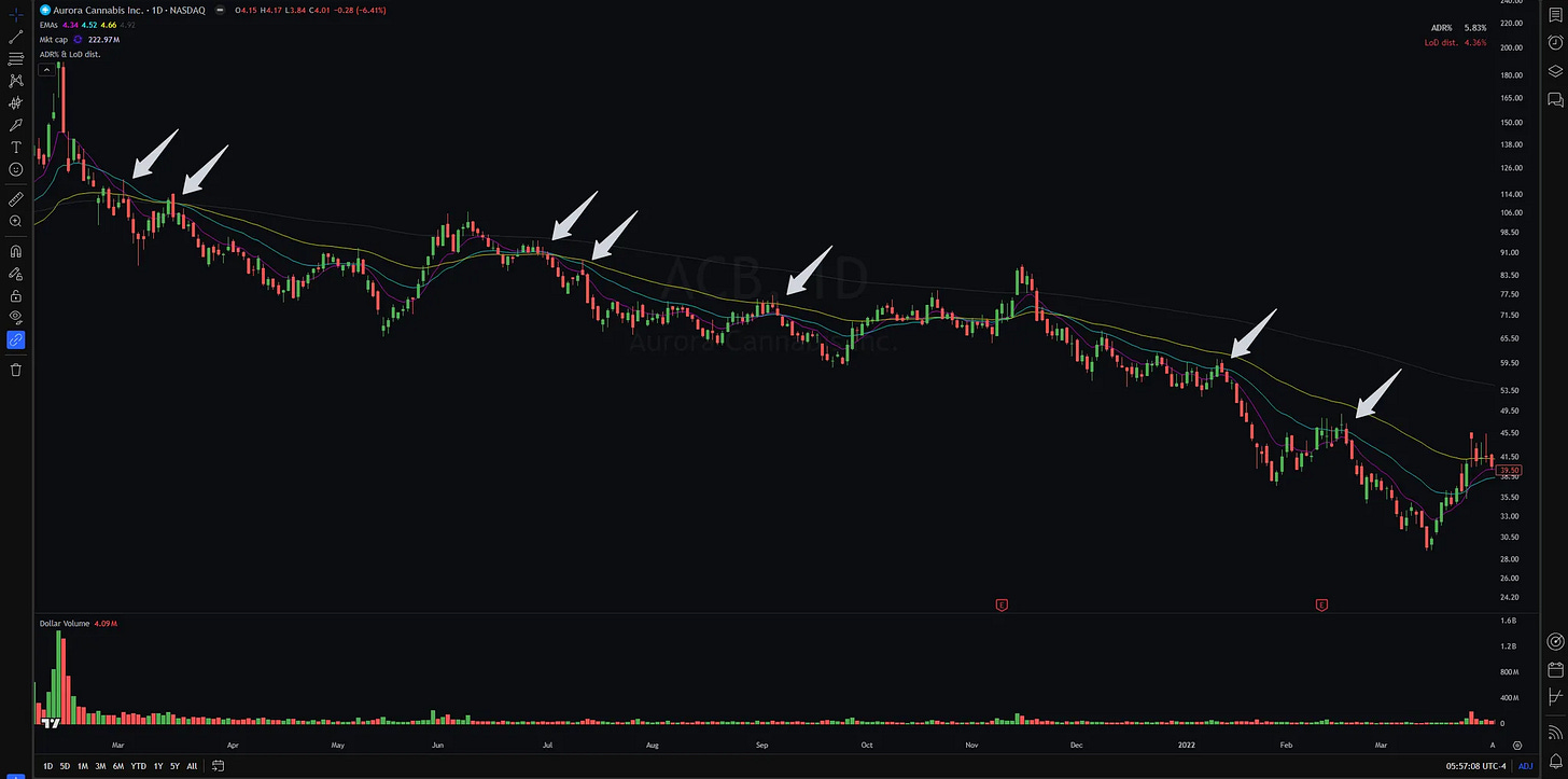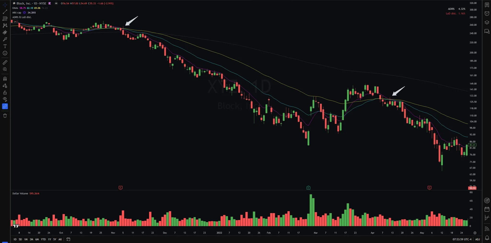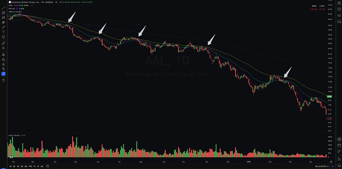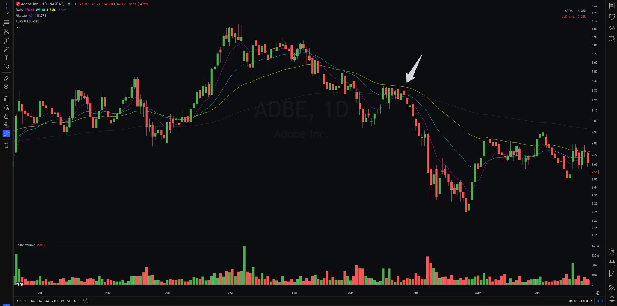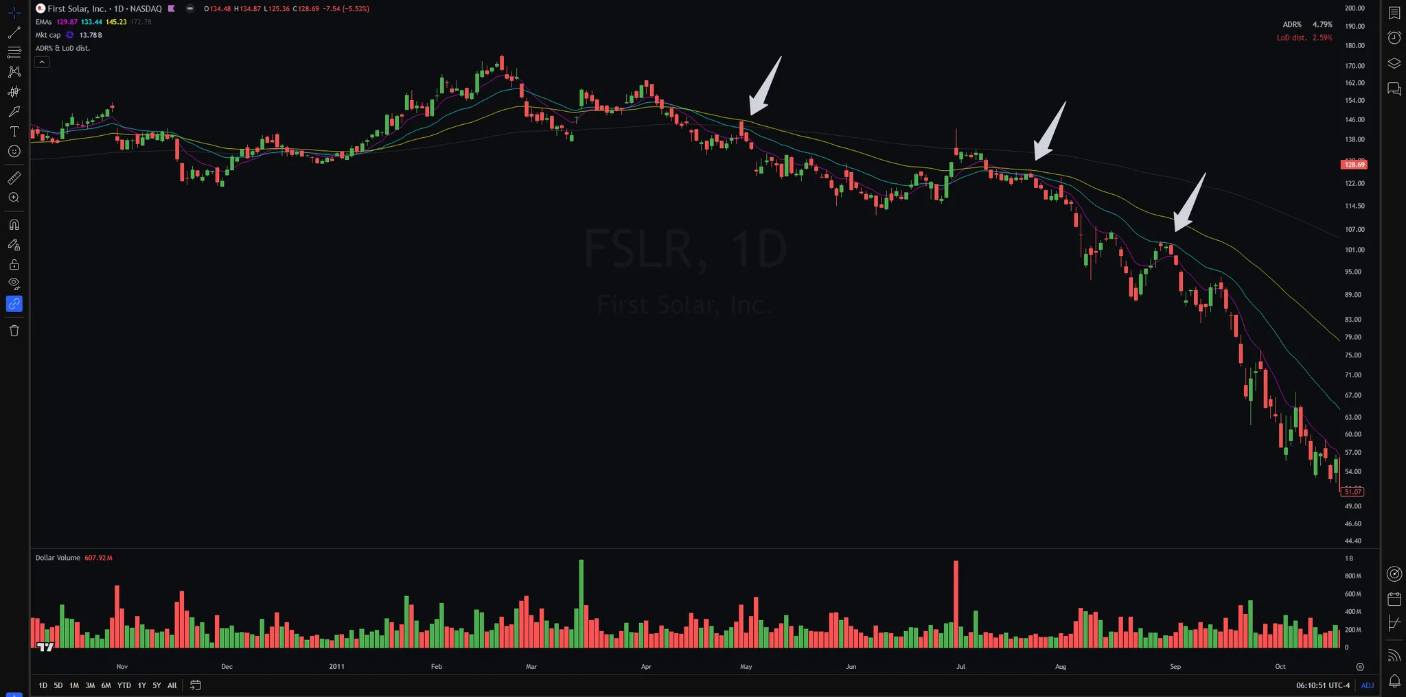 Stocks tend to decline immediately, without further basing, right after being rejected at the declining moving averages, particularly the 21 and 50 EMAs.