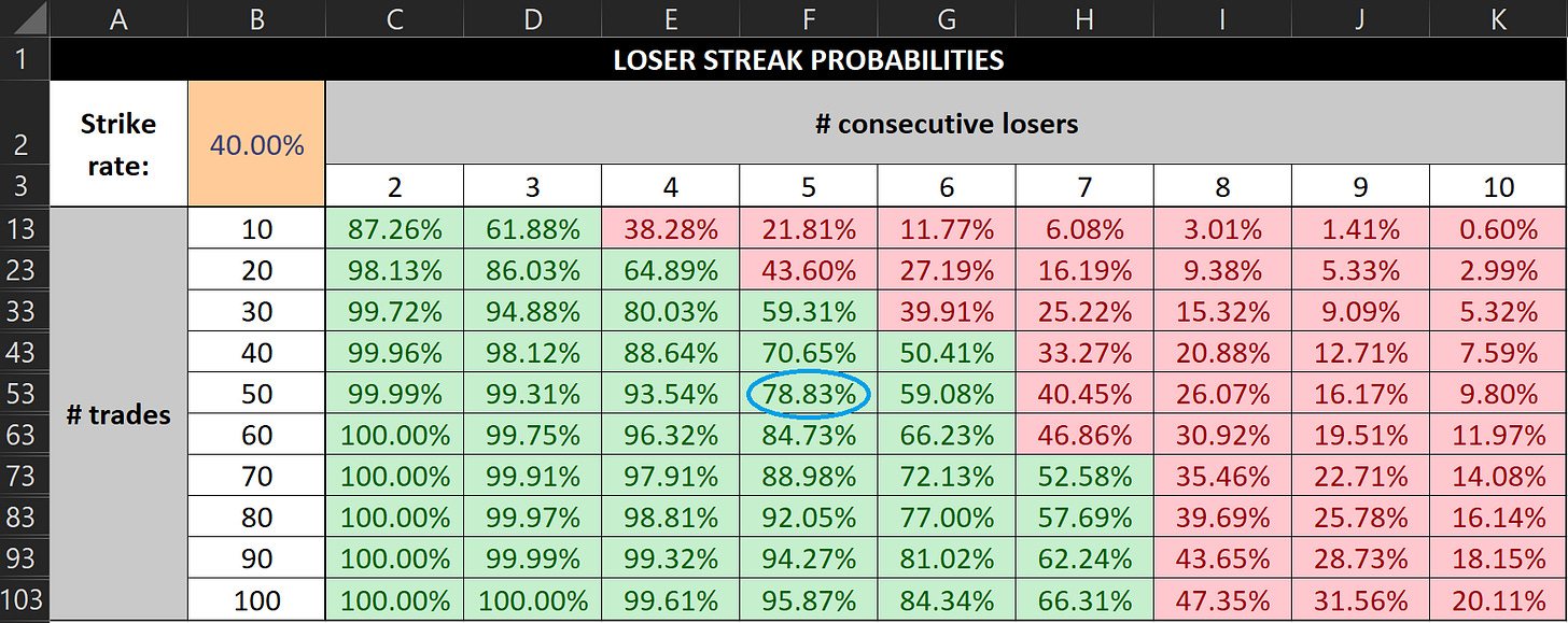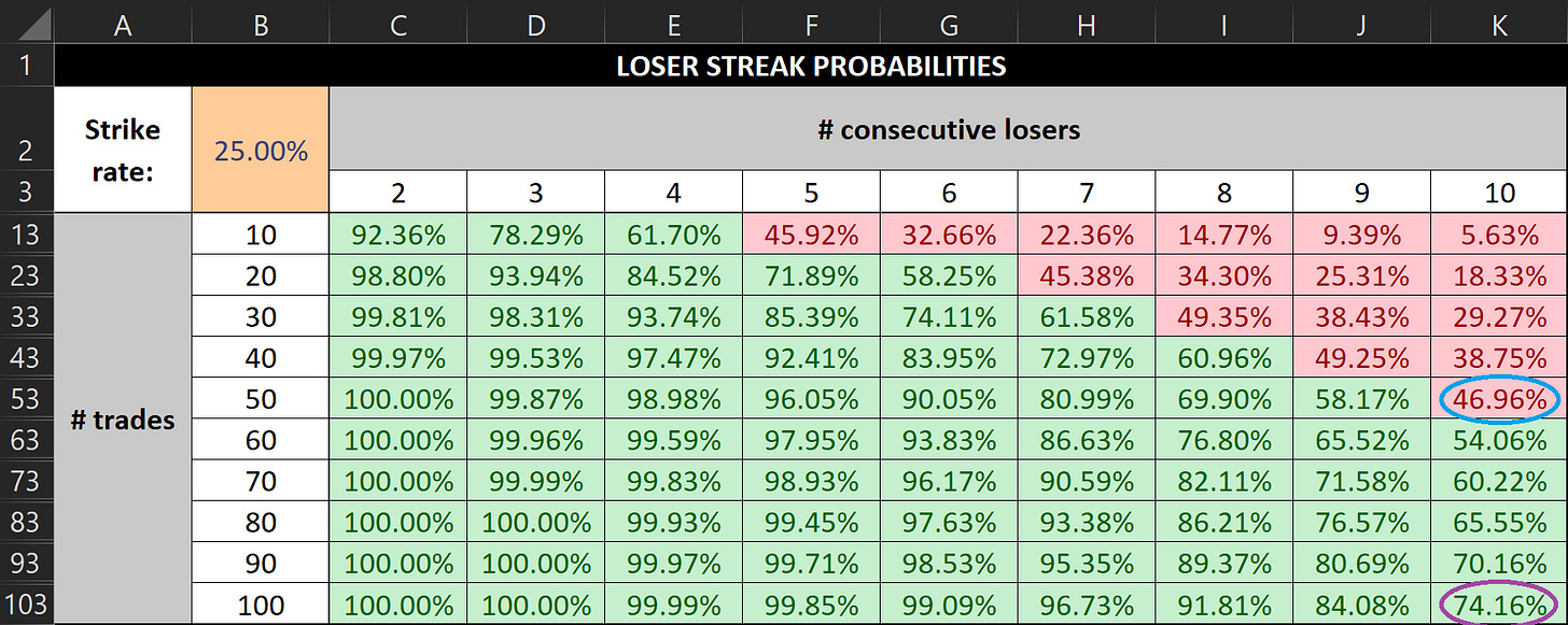 Well, with Kristjan’s 25% strike rate, the odds of getting 10 losers in a row over 50 trades increase to 46.96% (circled in blue). And if we doubled that — i.e. if we looked at the odds across 100 trades — the chances of getting 10 consecutive losers jumps to 74.16% (circled in purple).