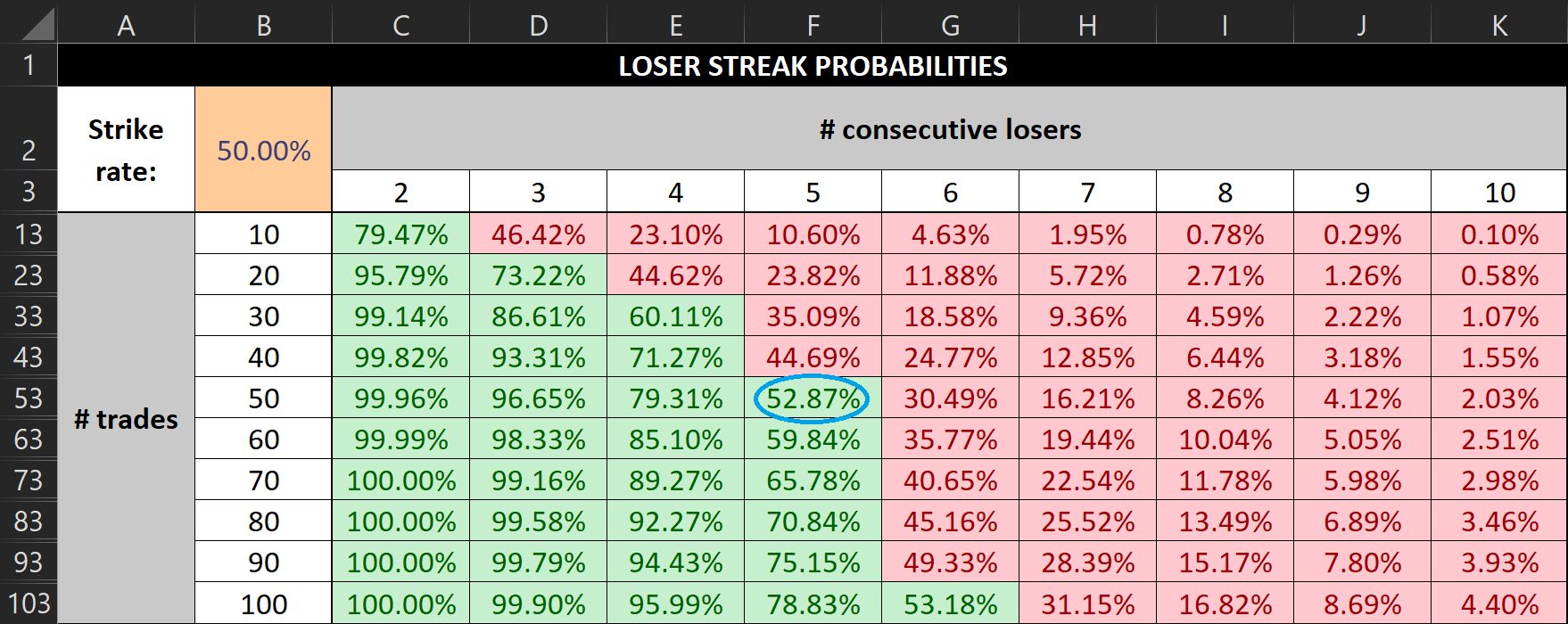 To answer such questions, I figured I’d build a calculator in Excel that allows me to play around with different strike rates to see how this affects the odds of having 2–10 consecutive losers within different numbers of trades.