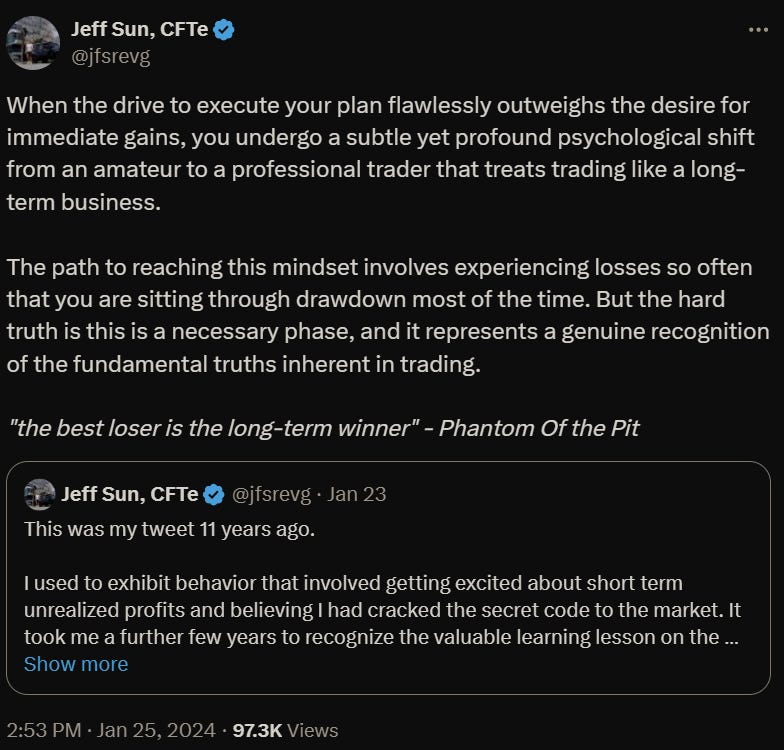 “I’ve learnt that being in a positive feedback loop is the only thing that prevents me from engaging in destructive self-sabotage. My healthiest relationship with trading is when I can wire money out every month, and my equity curve is smooth.”